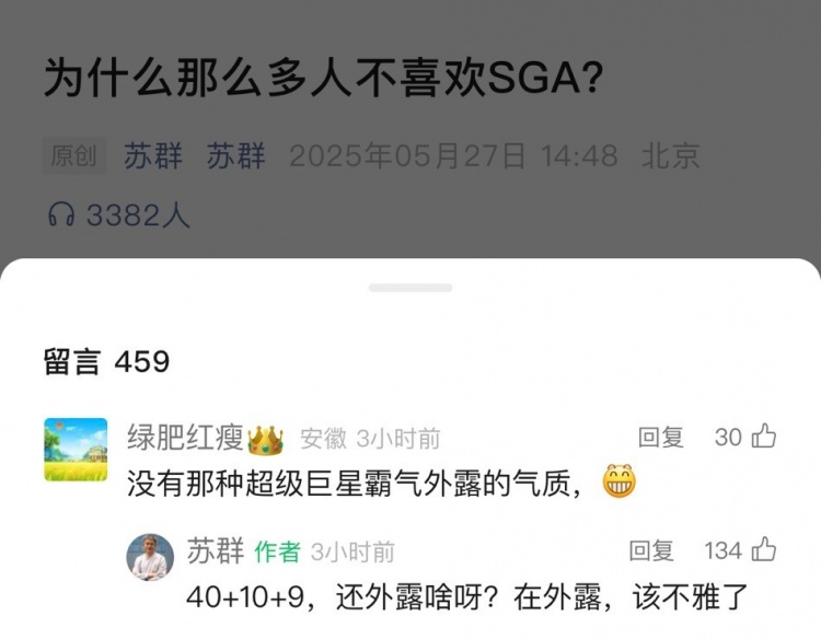 5月27日讯 今日西决G4雷霆128-126险胜森林狼,大比分3-1领先。 赛后,篮球解说员苏群发文《为什么那么多人不喜欢SGA?》,在评论区,苏群和球迷互动。有球迷写道:“SGA没有霸气外露的气质”,苏群回复道:“40+10+9,还外露啥呀?再外露,该不雅了。”