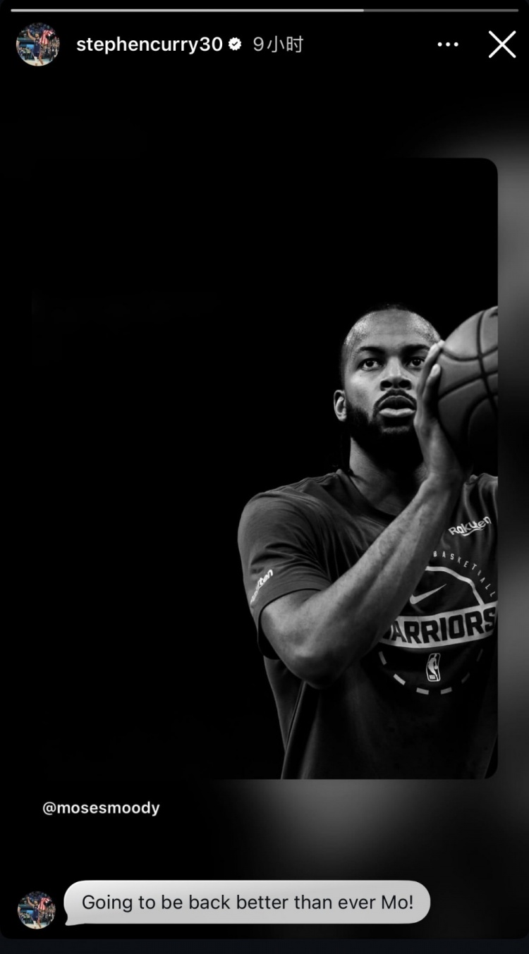 3月30日讯 今日,勇士球星库里更新了Instagram Story。库里转发了队友穆迪向外界关心其伤情致谢的帖子,并评论道:“摩西,你将在回归后比以往更强大!”勇士官方昨日宣布,穆迪成功接受膑腱修复手术,将进行完全康复,预计下赛季训练营期间更新伤情。等你归来!穆迪发推:感激所有关爱 我将迎接新挑战