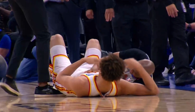 比赛末节,比塔泽在防守中从身后一把拉下空中的兰代尔,致其膝盖着。