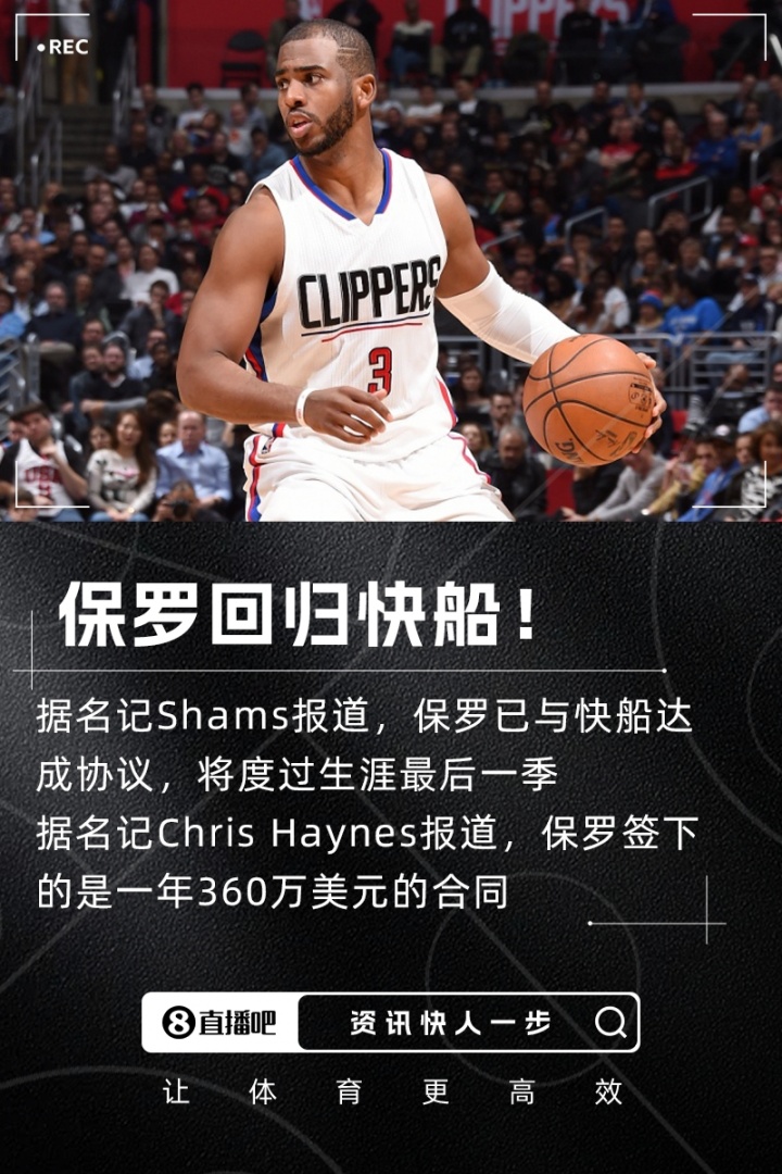队记:保罗明白自己在快船不会有太多上场时间 但还是决定回归